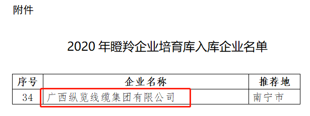 近日,自治區(qū)科技廳對(duì)外公示了廣西壯族自治區(qū)2020年瞪羚企業(yè)培育庫入庫企業(yè)名單。經(jīng)企業(yè)申報(bào)、相關(guān)部門推薦、專家評(píng)審等程序,縱覽線纜集團(tuán)從眾多企業(yè)中脫穎而出,入選了榜單。 |