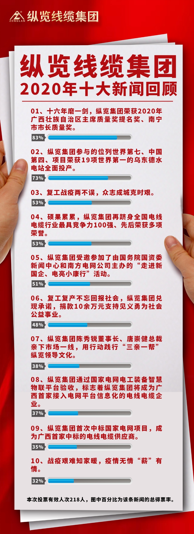 為了讓更多的縱覽人主動關(guān)心公司的發(fā)展與成長,共享成果的自豪與榮耀,值此一元復(fù)始之際,公司特舉辦“2020年度十大新聞”評選活動,經(jīng)過大家的積極投票,評選出了“縱覽線纜集團2020年度十大新聞”,讓我們一起來回顧一下! 1、復(fù)工戰(zhàn)疫兩不誤,眾志成城克時艱。 2020年1月26日大年初二起,縱覽人即同全國人民一起防疫戰(zhàn)疫,與“新冠肺炎病毒”展開了一場生死的較量。1月30日當全國人民還放放假閉關(guān)中,縱覽即因戰(zhàn)疫需要,成立了以陳秀銳董事長為首的“縱覽疫情防控支援突擊隊”,快速啟動突發(fā)事件應(yīng)急預(yù)案,先后組織向各地電網(wǎng)救災(zāi)一線勇士們捐獻疫情緊缺物資口罩一萬枚,緊急組織供貨約2000萬元的電纜援建“小湯山式”疫情醫(yī)院……縱覽戰(zhàn)疫故事先后被廣西電視臺、電線電纜報、中國機械工業(yè)協(xié)會等多家媒體多次報道,成為抗擊疫情行動的先進單位。 疫情防控關(guān)乎生命,而安全復(fù)工則關(guān)乎員工生計、企業(yè)的命脈和社會穩(wěn)定,因此,如何安全復(fù)工,減少疫情對經(jīng)濟的影響、對企業(yè)和員工的影響是企業(yè)疫情防控之外的另一場硬仗。萬難之際,縱覽人眾志成城,從疫情防護物資的急采配置、廠區(qū)嚴控出入、員工日健康信息報告、返廠隔離、防疫培訓(xùn)、用餐隔離到公司領(lǐng)導(dǎo)精準施策、管理層執(zhí)行不打折扣,加班產(chǎn)出、加班發(fā)貨等等,無不顯示出縱覽人將壓力變?yōu)閯恿Α⒒闄C、戰(zhàn)勝疫情和經(jīng)濟壓力的勇氣和信心。 2、十六年磨一劍,縱覽集團榮獲2020年廣西壯族自治區(qū)主席質(zhì)量獎提名獎、南寧市市長質(zhì)量獎。 十六年磨一劍,2020年12月,縱覽集團先后榮獲廣西壯族自治區(qū)主席質(zhì)量獎提名獎、南寧市市長質(zhì)量獎,企業(yè)經(jīng)營成果和質(zhì)量管理水平得到政府部門的高度認可。 面對集團首次申報、經(jīng)驗不足、競爭強手如林的不利情況下,陳秀銳董事長要求創(chuàng)獎團隊誓必成功,唐崇健總裁帶領(lǐng)創(chuàng)獎團隊擰成一股繩,日以繼夜,以卓越績效管理體系為綱,不斷突破、對公司各業(yè)務(wù)版塊的信息資料進行收集和整理,通過多次會議和頭腦風暴,深挖亮點,組織編寫了超17萬字的創(chuàng)獎申報材料、制作了15個現(xiàn)場匯報的PPT,同時,通過對匯報和評審的反復(fù)演練,終于在各環(huán)節(jié)以出色的表現(xiàn)贏得了評審專家的肯定,獲得了高分,一鼓作氣連續(xù)拿下廣西壯族自治區(qū)主席質(zhì)量獎提名獎和南寧市市長質(zhì)量獎,成為創(chuàng)獎企業(yè)中的黑馬。 廣西壯族自治區(qū)主席質(zhì)量獎是廣西壯族自治區(qū)實施質(zhì)量興桂戰(zhàn)略工作領(lǐng)導(dǎo)小組組織實施,主要授予有廣泛的社會知名度和影響力、實施卓越績效管理模式、質(zhì)量管理水平和自主創(chuàng)新能力在國內(nèi)同行業(yè)處于領(lǐng)先地位、取得顯著經(jīng)濟效益和社會效益的企業(yè)和相關(guān)組織,該獎項評選標準高、評審過程嚴,每屆獲獎的企業(yè)或組織總數(shù)不超過4個,提名獎不超過8個。縱覽集團作為民營企業(yè),能在強手如林的國企、央企、上市公司中脫穎而出,獲得政府和各界的認可,實屬不易。 3、戰(zhàn)疫艱難知家暖,疫情無情“薪”有情。 2020年1月底,因疫情影響企業(yè)復(fù)工延期,部分企業(yè)被迫停產(chǎn)、陷入經(jīng)營危機。為讓縱覽家人安心 ,公司及時發(fā)布疫情時期的薪資發(fā)放政策,政策不僅明確了員工疫情時期的生活保障,還暖心地對疫情期奮戰(zhàn)在生產(chǎn)一線的操作工、保安人員給予了工資以外的激勵補貼,讓員工們在不安的環(huán)境中因企業(yè)的擔當而感受到了安全,感受到了艱難時公司對員工的關(guān)愛和縱覽大家庭的溫暖。
