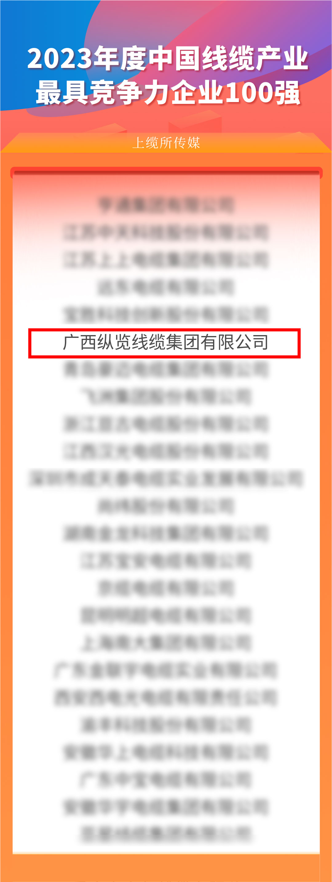 9月3日,由電線電纜網(wǎng)和線纜世界聯(lián)合主辦的“2023年度中國(guó)線纜產(chǎn)業(yè)最具競(jìng)爭(zhēng)力企業(yè)”頒獎(jiǎng)典禮在上海隆重發(fā)布??v覽線纜集團(tuán)作為廣西工業(yè)龍頭企業(yè)再次榮登“2023年度中國(guó)線纜行業(yè)最具競(jìng)爭(zhēng)力企業(yè)100強(qiáng)”榜單,至此已連續(xù)5年上榜。 中國(guó)線纜產(chǎn)業(yè)最具競(jìng)爭(zhēng)力企業(yè)評(píng)測(cè)活動(dòng)通過(guò)對(duì)全國(guó)近萬(wàn)家線纜企業(yè)的規(guī)模、企業(yè)效益、研發(fā)創(chuàng)新、品牌知名度等多個(gè)維度進(jìn)行分析評(píng)價(jià),評(píng)選出上榜企業(yè),榜單極具專業(yè)性、權(quán)威性和公信力。 再次獲得此榮譽(yù),既是肯定,也是鞭策。未來(lái),縱覽線纜集團(tuán)將持續(xù)秉承“做好產(chǎn)品回報(bào)客戶,做好企業(yè)回報(bào)社會(huì)”的使命愿景,在“服務(wù)電網(wǎng)、走進(jìn)萬(wàn)家”發(fā)展戰(zhàn)略引領(lǐng)下勇毅前行,持續(xù)提升品牌形象、科研能力、產(chǎn)品質(zhì)量等綜合實(shí)力,為助推線纜行業(yè)高質(zhì)量發(fā)展貢獻(xiàn)縱覽力量。 |