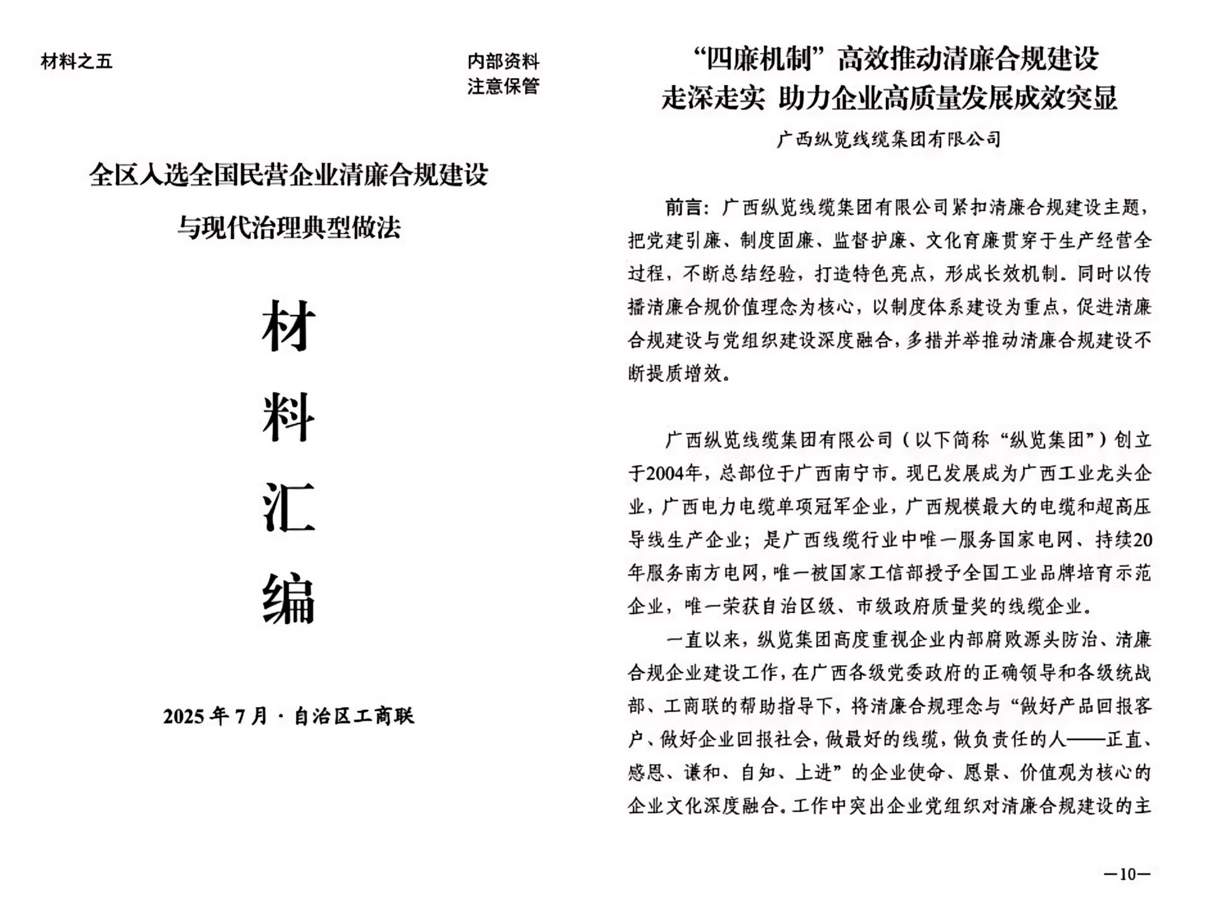 7月14-15日,2025年全區(qū)清廉民企建設提質增效現(xiàn)場推進活動暨民營企業(yè)建立完善中國特色現(xiàn)代企業(yè)制度試點工作啟動會在來賓召開 。來賓市委書記何朝建致辭;自治區(qū)黨委統(tǒng)戰(zhàn)部副部長、工商聯(lián)黨組書記、清廉民企建設專責小組組長丘德彬,自治區(qū)黨委巡視組副組長、巡視專員、清廉廣西領導小組辦公室綜合組副組長張勤儉分別講話。期間,與會代表實地觀摩學習了來賓有關企業(yè)、商會清廉建設的做法經(jīng)驗,聆聽了浙大教授作的民營企業(yè)治理現(xiàn)代化專題輔導;會議還發(fā)放了《全區(qū)入選全國民營企業(yè)清廉合規(guī)建設與現(xiàn)代化治理典型做法》等交流學習材料,我縱覽線纜集團的《“四廉機制”高效推動清廉合規(guī)建設走深走實 助力企業(yè)高質量發(fā)展成效突顯》做法代表廣西線纜行業(yè)與其他19家民營企業(yè)光榮入選。 一直以來,我集團高度重視企業(yè)內部腐敗源頭防治、清廉合規(guī)企業(yè)建設工作,在廣西各級黨委政府的正確領導和各級統(tǒng)戰(zhàn)部、工商聯(lián)的幫助指導下,將清廉合規(guī)理念與“做好產(chǎn)品回報客戶、做好企業(yè)回報社會,做最好的線纜,做負責任的人——正直、感恩、謙和、自知、上進”的企業(yè)使命、愿景、價值觀為核心的企業(yè)文化深度融合。工作中突出企業(yè)黨組織對清廉合規(guī)建設的主導地位,充分發(fā)揮黨支部的政治功能和組織功能,多措并舉擦亮民企清廉底色,實現(xiàn)了清廉合規(guī)建設與企業(yè)經(jīng)營工作有機契合、一體推動、兩不誤雙促進;形成了“優(yōu)在制度、重在執(zhí)行、嚴在監(jiān)督、成在整改”這一縱覽集團獨特、長效的企業(yè)內部腐敗源頭防治機制和企業(yè)經(jīng)營管理體系,實現(xiàn)了清廉合規(guī)建設與企業(yè)生產(chǎn)經(jīng)營有機契合、一體推動、兩不誤雙促進,在構建親清統(tǒng)一的新型政商關系、營造風清氣正的市場環(huán)境中進行了卓有成效的探索和實踐,有效推動了企業(yè)內部腐敗源頭防治、清廉合規(guī)建設在縱覽集團走深走實,取得積極成效。 我們真切體會到:清廉合規(guī)建設在縱覽集團高質量發(fā)展過程中發(fā)揮著重要作用,有效推動了企業(yè)內外關系的和諧發(fā)展和社會責任的履行,有效推動了經(jīng)營業(yè)務的拓展、社會形象的提升。一方面,集團實現(xiàn)了連續(xù)6年進入中國機械500強、中國線纜產(chǎn)業(yè)最具競爭力企業(yè) 100 強,廣西制造業(yè)企業(yè)、廣西民營企業(yè)、廣西民營企業(yè)制造業(yè) 100 強;實現(xiàn)連續(xù) 5 年獲評廣西守合同重信用企業(yè),連續(xù)9年被國家稅務總局評為“納稅信用 A級企業(yè)”;先后榮獲“國家高新技術企業(yè)、國家級綠色工廠、國家知識產(chǎn)權優(yōu)勢企業(yè),廣西工業(yè)龍頭企業(yè)、廣西電力電纜單項冠軍企業(yè)、廣西壯族自治區(qū)主席質量獎提名獎、廣西智能工廠示范企業(yè)、廣西專精特新企業(yè)、廣西工業(yè)企業(yè)質量管理標桿、廣西技術創(chuàng)新示范企業(yè)、南寧市市長質量獎、南寧市清廉民營企業(yè)建設標桿企業(yè)、南寧市清廉民營企業(yè)建設先進單位等榮譽稱號。另一方面,集團重點優(yōu)質客戶實現(xiàn)持續(xù)增加,在電網(wǎng)建設領域服務區(qū)域從南方電網(wǎng)的5省區(qū)已擴展至全國16個省區(qū)市的同時,還成為中交集團、中建集團、中能建集團、廣西投資集團、廣西北港集團、廣西北投集團、廣西交投集團、廣西建工集團、廣西現(xiàn)代物流集團、柳鋼集團和南寧軌道、南寧產(chǎn)投、南寧城投、建寧水務集團等20多家央地國企的優(yōu)秀供應商。集團結合企業(yè)經(jīng)營實際,在三年多的新冠疫情期間,主動承擔各區(qū)疫情防控所需的“小湯山”醫(yī)院用電線纜的緊急供應任務;向12所學校開展捐資助學活動;通過全額資助學費方式,支持、鼓勵廣西學子就讀河南工學院電線電纜專業(yè),為廣西培養(yǎng)電線電纜專業(yè)人才;集團每銷售1公里電線電纜產(chǎn)品向南寧市見義勇為基金會捐獻1元人民幣等社會公益活動受到社會各界廣泛贊譽。 |