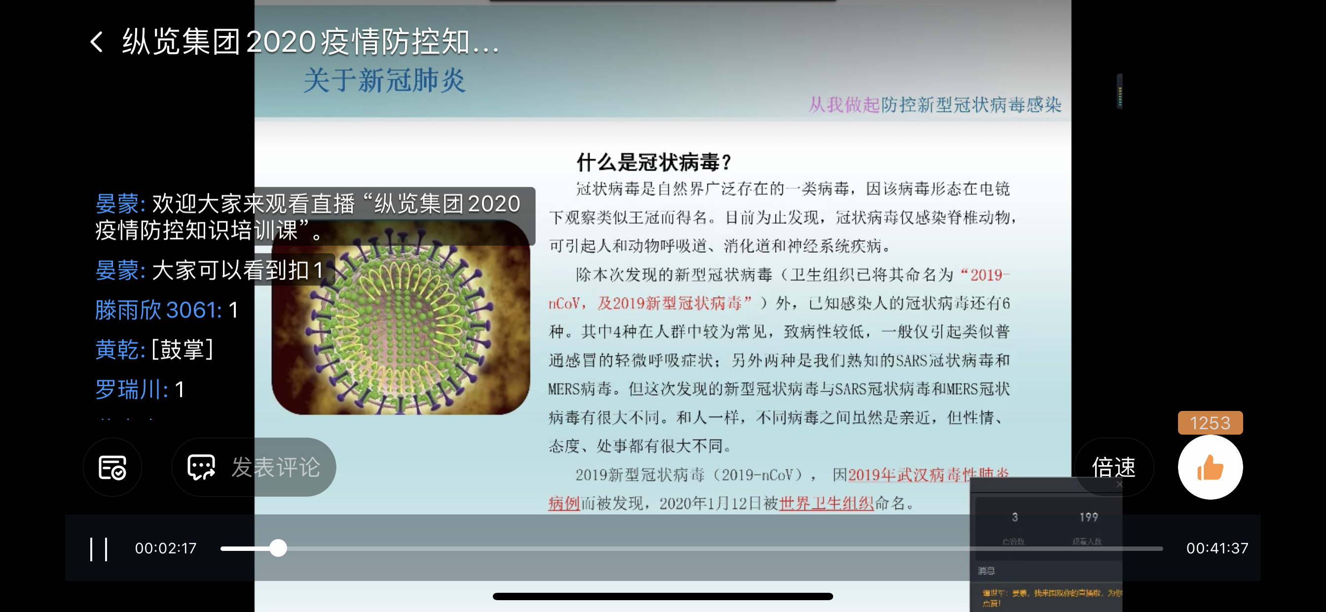 2月17日20點(diǎn)20分,廣西縱覽線纜集團(tuán)人力行政中心工作人員晏蒙以釘釘直播的形式,向全體員工進(jìn)行了一次新冠肺炎防控知識(shí)培訓(xùn),幫助大家正確認(rèn)識(shí)新型冠狀病毒,掌握科學(xué)防護(hù)方法。 “為了讓大家科學(xué)正確地了解防控知識(shí),今天我們以一種不一樣的模式開啟這堂培訓(xùn)課……”在此次視頻直播里,主播的語(yǔ)言生動(dòng)有趣又嚴(yán)謹(jǐn)科學(xué),同事們聽得津津有味。 本次直播分三個(gè)部分:一是關(guān)于新冠肺炎的相關(guān)知識(shí),二是疫情最新動(dòng)態(tài),三是疫情預(yù)防措施。 “效果非常好,語(yǔ)言清晰很流利!”低壓電纜事業(yè)部田利國(guó)觀看直播后說(shuō)道。 直播結(jié)束后,300多位員工在線完成并通過(guò)了本次新型冠狀病毒防治閉卷考試。 |