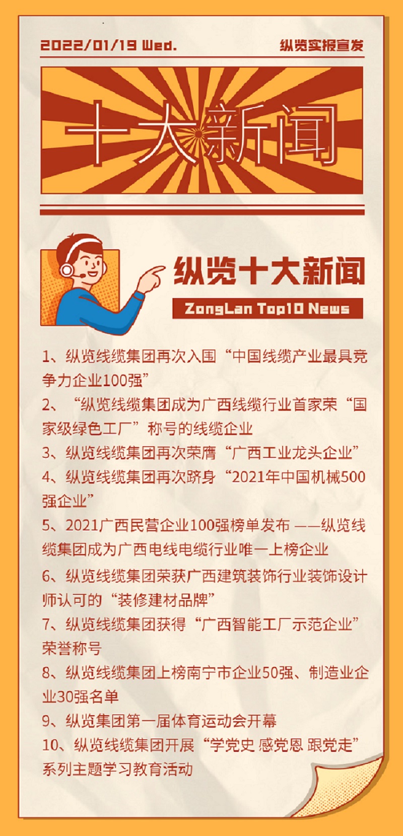 為了讓更多縱覽人主動(dòng)關(guān)心、了解公司的發(fā)展與成長(zhǎng),近期,縱覽線纜集團(tuán)開展了2021年度十大新聞評(píng)選,通過縱覽人的投票評(píng)選,最終評(píng)選出公司十大新聞,這是縱覽人在2021年這個(gè)時(shí)間刻度上的標(biāo)記。2022是新的起點(diǎn),我們必將砥礪前行,一路劈波斬浪。 TOP. 01 縱覽線纜集團(tuán)再次入圍“中國(guó)線纜行業(yè)最具競(jìng)爭(zhēng)力100強(qiáng)” 12月20日,2021年度中國(guó)線纜產(chǎn)業(yè)最具競(jìng)爭(zhēng)力企業(yè)榜單揭曉,縱覽線纜集團(tuán)憑借強(qiáng)勁的實(shí)力、突出的競(jìng)爭(zhēng)力,榮膺“2021年度中國(guó)線纜產(chǎn)業(yè)最具競(jìng)爭(zhēng)力企業(yè)100強(qiáng)”。 多年來,集團(tuán)始終致力科技引領(lǐng)、技術(shù)創(chuàng)新,實(shí)施綠色制造、智能制造工程,強(qiáng)化內(nèi)部管理,控本增效、質(zhì)量提升、精細(xì)服務(wù),以客戶為關(guān)注焦點(diǎn),以服務(wù)地方經(jīng)濟(jì)發(fā)展為己任,不斷提升行業(yè)競(jìng)爭(zhēng)力和品牌影響力,為廣西“強(qiáng)首府戰(zhàn)略”深入實(shí)施和廣西工業(yè)振興、社會(huì)經(jīng)濟(jì)高質(zhì)量發(fā)展作出應(yīng)有貢獻(xiàn)。