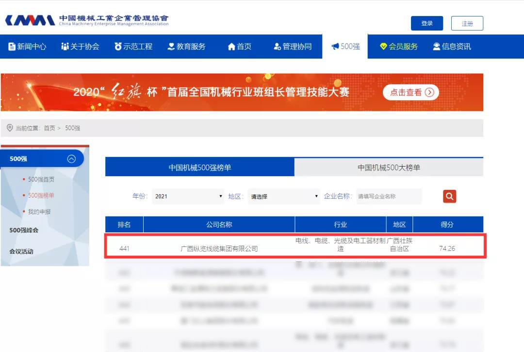TOP. 04 縱覽線纜集團(tuán)再次躋身“2021年中國(guó)機(jī)械500強(qiáng)企業(yè)” 日前,2021年中國(guó)機(jī)械500強(qiáng)榜單發(fā)布,廣西縱覽線纜集團(tuán)有限公司是廣西電線電纜行業(yè)唯一上榜企業(yè)。在新冠疫情和原材料價(jià)格高漲疊加因素環(huán)境下,我集團(tuán)連續(xù)上榜中國(guó)機(jī)械500強(qiáng)企業(yè)榜單,充分彰顯了縱覽線纜集團(tuán)在科研技術(shù)、質(zhì)量管控、市場(chǎng)開拓、創(chuàng)新發(fā)展上的綜合實(shí)力和高質(zhì)量發(fā)展的水平,將有力促進(jìn)縱覽品牌的美譽(yù)度和市場(chǎng)影響力。