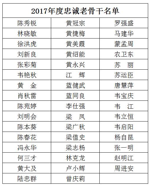 你們是堅韌不摧的榜樣力量,你們是縱覽發(fā)展史上的勞模功勛!你們時刻心系縱覽的憂患,與縱覽同風雨、共命運,用不懈的努力為縱覽創(chuàng)造著每一筆財富,正是因為你們的付出,縱覽的今天才能夠如此絢麗,感謝你們,為縱覽這個大家庭添磚加瓦!你們的名字將永遠銘刻在縱覽的功勞薄上! 讓我們一睹縱覽線纜集團2017年度忠誠骨干老員工的風采! 陳秀銳 林曉敏 徐洪虎 劉新良 張彩菊 韋艷秋 黃金 肖秋雷 劉明會 黃捷梅 陳苑婷 曾慶莉 陳本葵 陳春花 馮永華 何三才 黃大及 黃冠宗 黃美霞 黃紹能 黃永興 江輝 藍建武 藍同良 李仕強 梁鳳 梁廣秋 梁值史 梁志楊 林克龍 盧小輝 陸忠群 羅強盛 馬建華 蒙孟周 農衛(wèi)東 蘇麗 蘇運臣 唐慧萍 韋寶慶 韋江 韋立恒 韋啟陽 楊自昆 張一明 趙明江 周進安 |